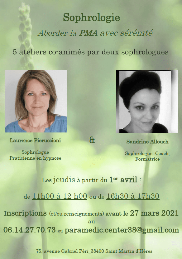 >> Au 01/04/21 – Pour information, les ateliers « Sophrologie et PMA » sont reportés en septembre.