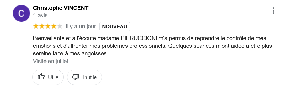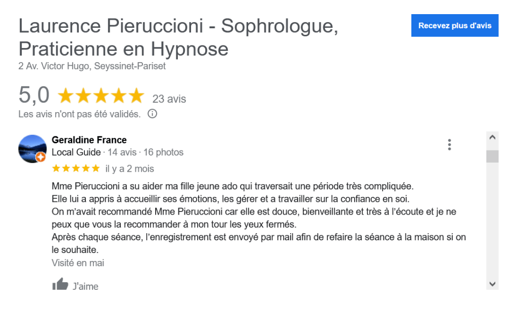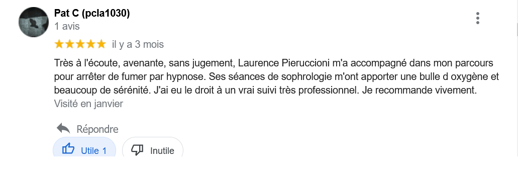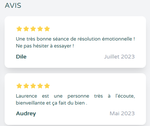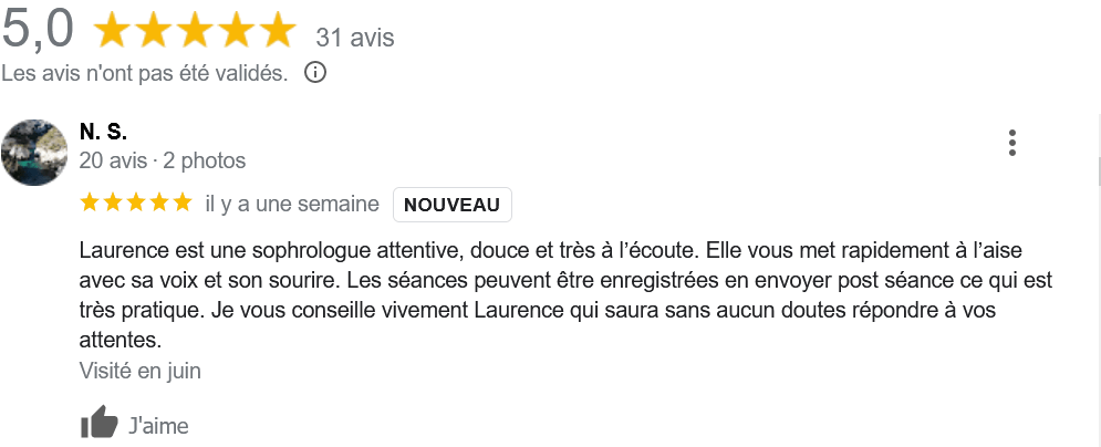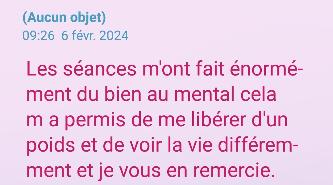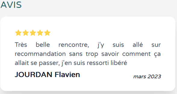 Un grand merci pour ces retours d’expérience et avis que vous avez faits suite à mon accompagnement en sophrologie, Résolution Émotionnelle ou Hypnose.