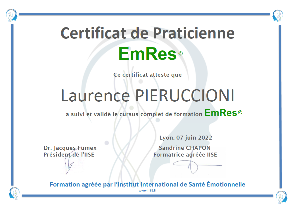 Dans une volonté de développer mon champ de compétences, j’ai décidé de suivre une formation en Résolution Émotionnelle – EmRes. Cette méthode a pour but de faciliter l’évacuation des blocages émotionnels générateurs de tensions physiques et mentales.