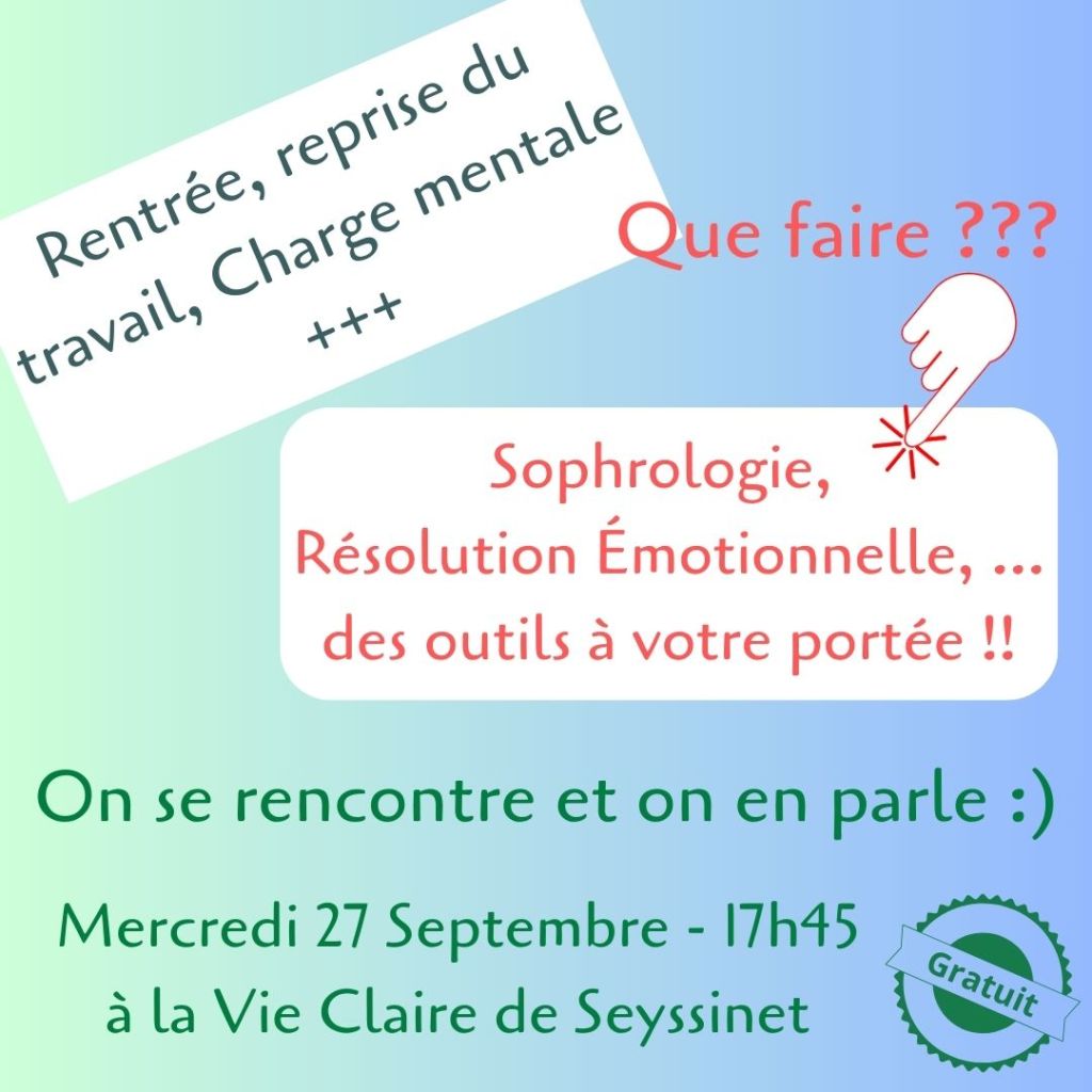 - 17h30 à 19h : Table ronde à la Salle Moucherotte (21, rue du Moucherotte, Seyssinet-Pariset). Il est préférable de se pré-inscrire soit par mail : laurencep.sophro@gmail.com soit par téléphone : 06 03 12 04 94