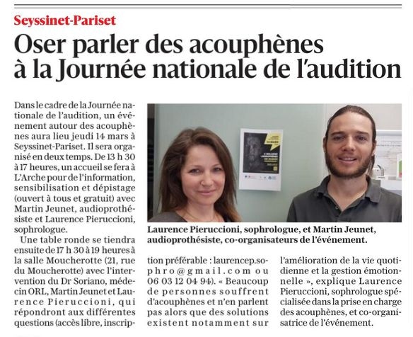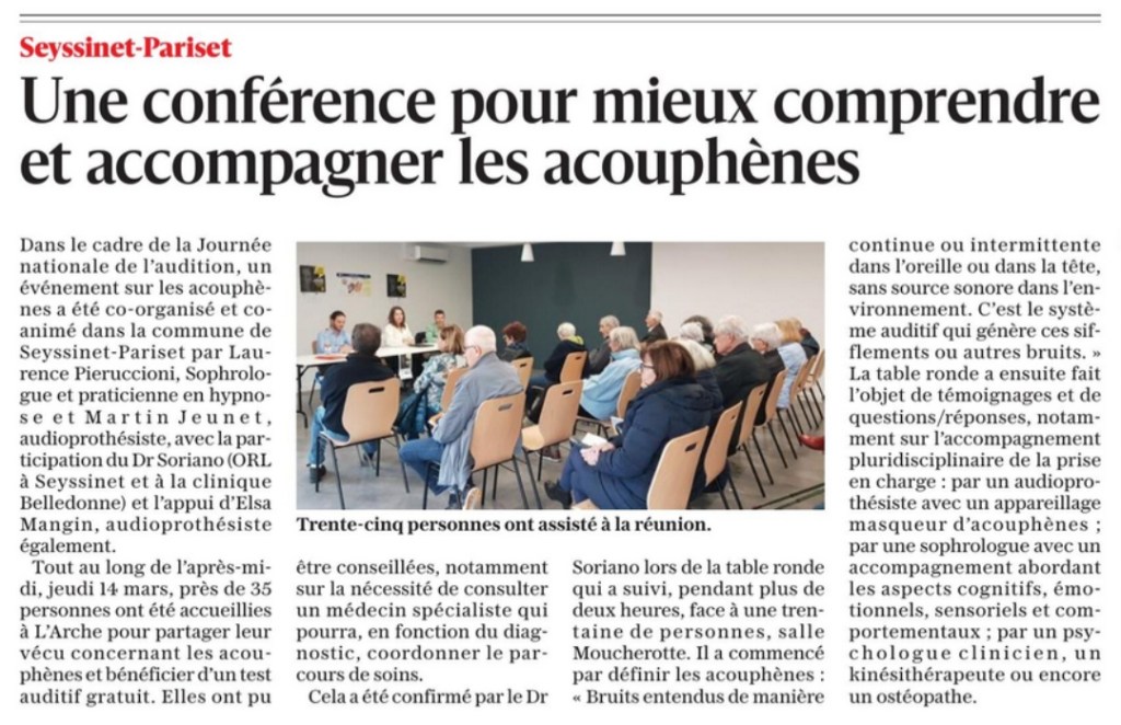 Le 14 Mars prochain, à l’occasion de la 27ème campagne de la Journée Nationale de l’Audition, en association avec Krys Audition, le Dr SORIANO – Médecin ORL et la Commune de Seyssinet-Pariset, j’organise une demi-journée de rencontre sur le thème de l’Acouphène.
