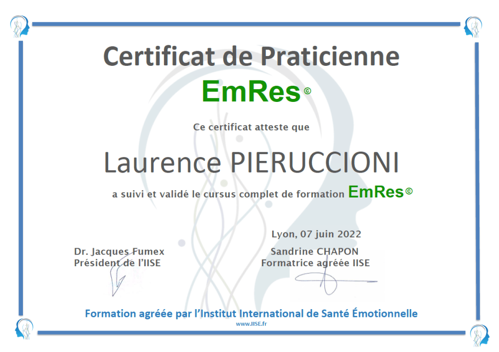 — 2021 et 2022 : formation à la méthode EmRes – La Résolution Émotionnelle, agréée par l’institut International de Santé Émotionnelle.