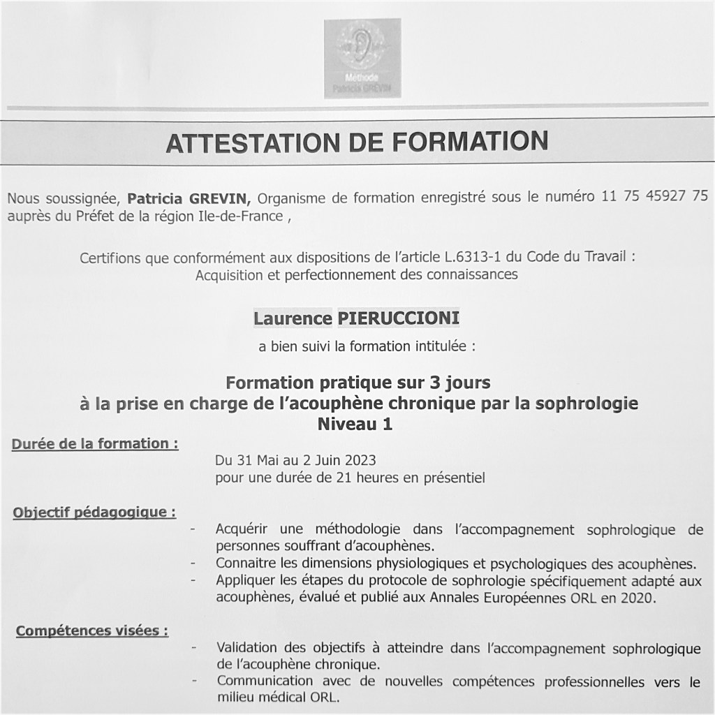 — 2023 et 2024 : Formation à la prise en charge de l’acouphène chronique par la sophrologie Formations créées et animées par Patricia GREVIN